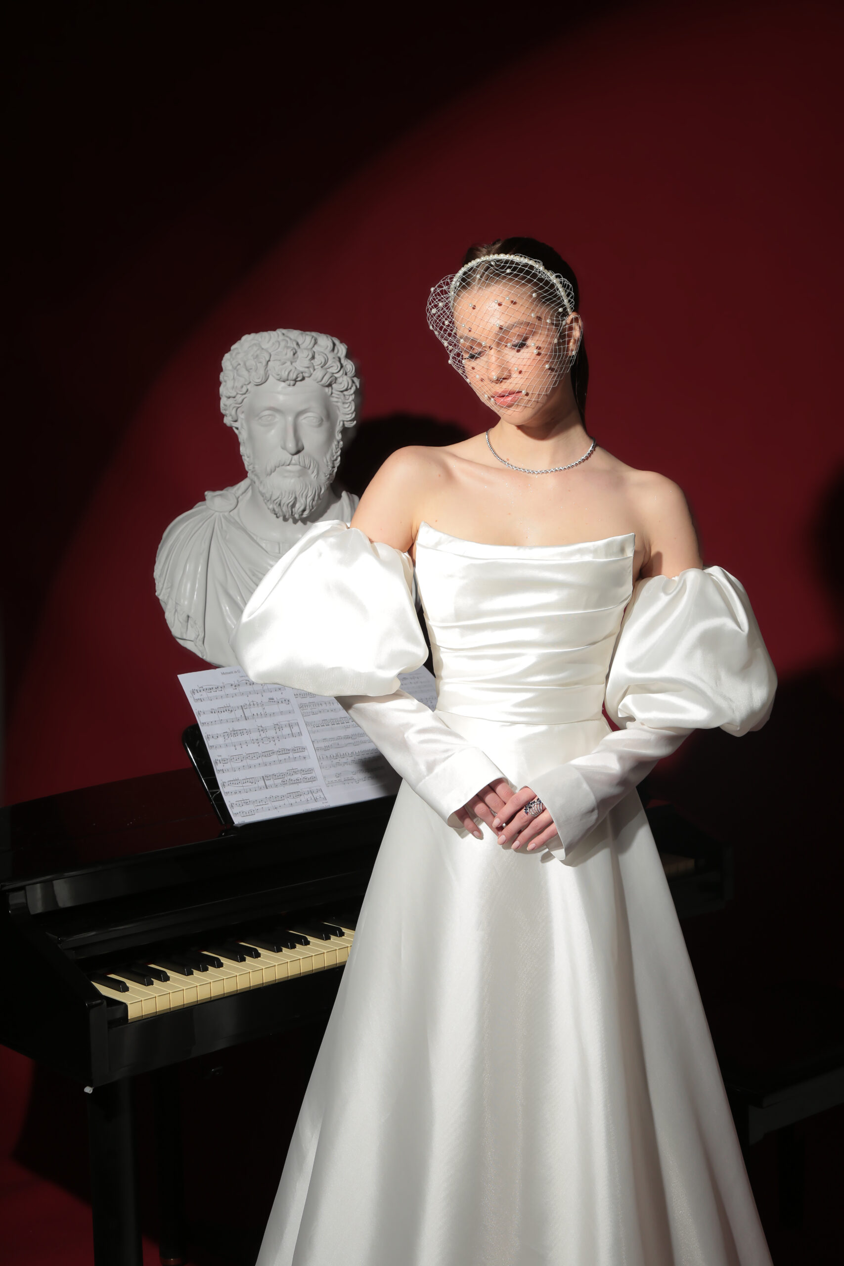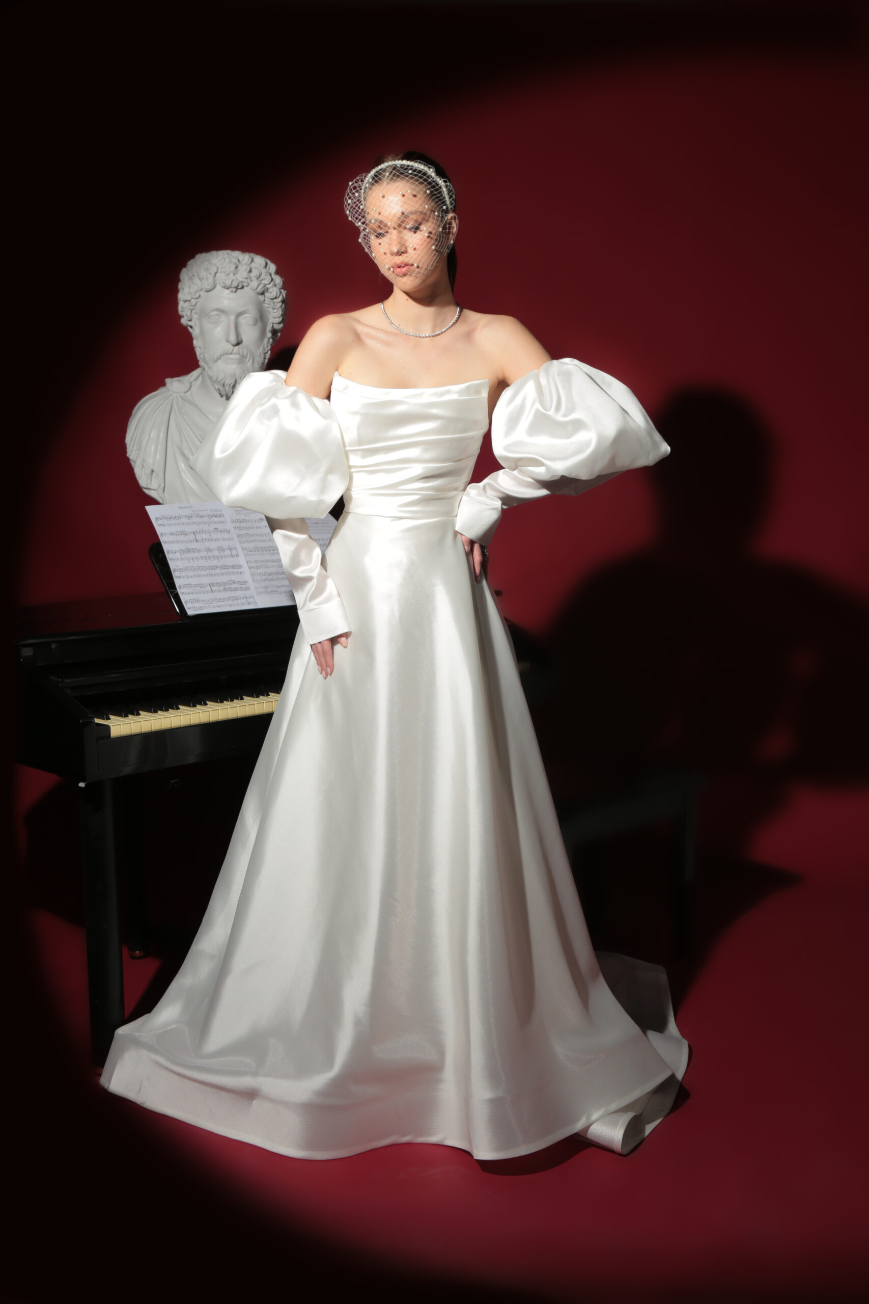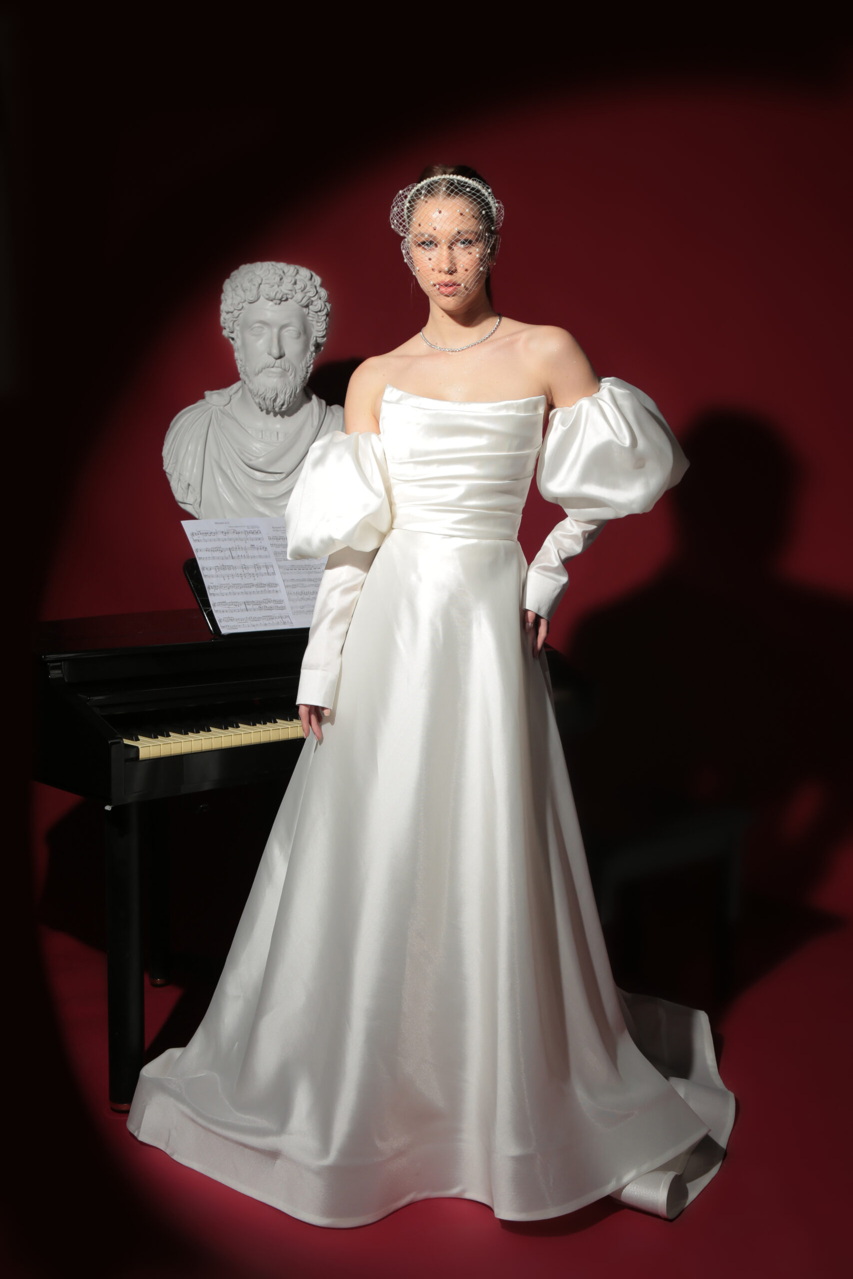 Saten kumaşla tasarlanan tasarımın üst bedeni geniş drape detaylarla hareketlendirilmiştir. Takıp çıkarılabilir kol detayına ek olarak saten eldivenle de kombinlenebilir