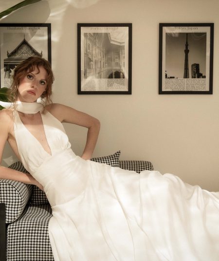Dantel İşlemeli V Yaka A Kesim Gelinliğin detayları Helenistik dönemdeki sütun ve heykellerden ilham alır. Bu detaylar, gelinliğe antik bir hava verirken, bu tasarım aynı zamanda farklı tipte duvaklarla kombinlenebilir.