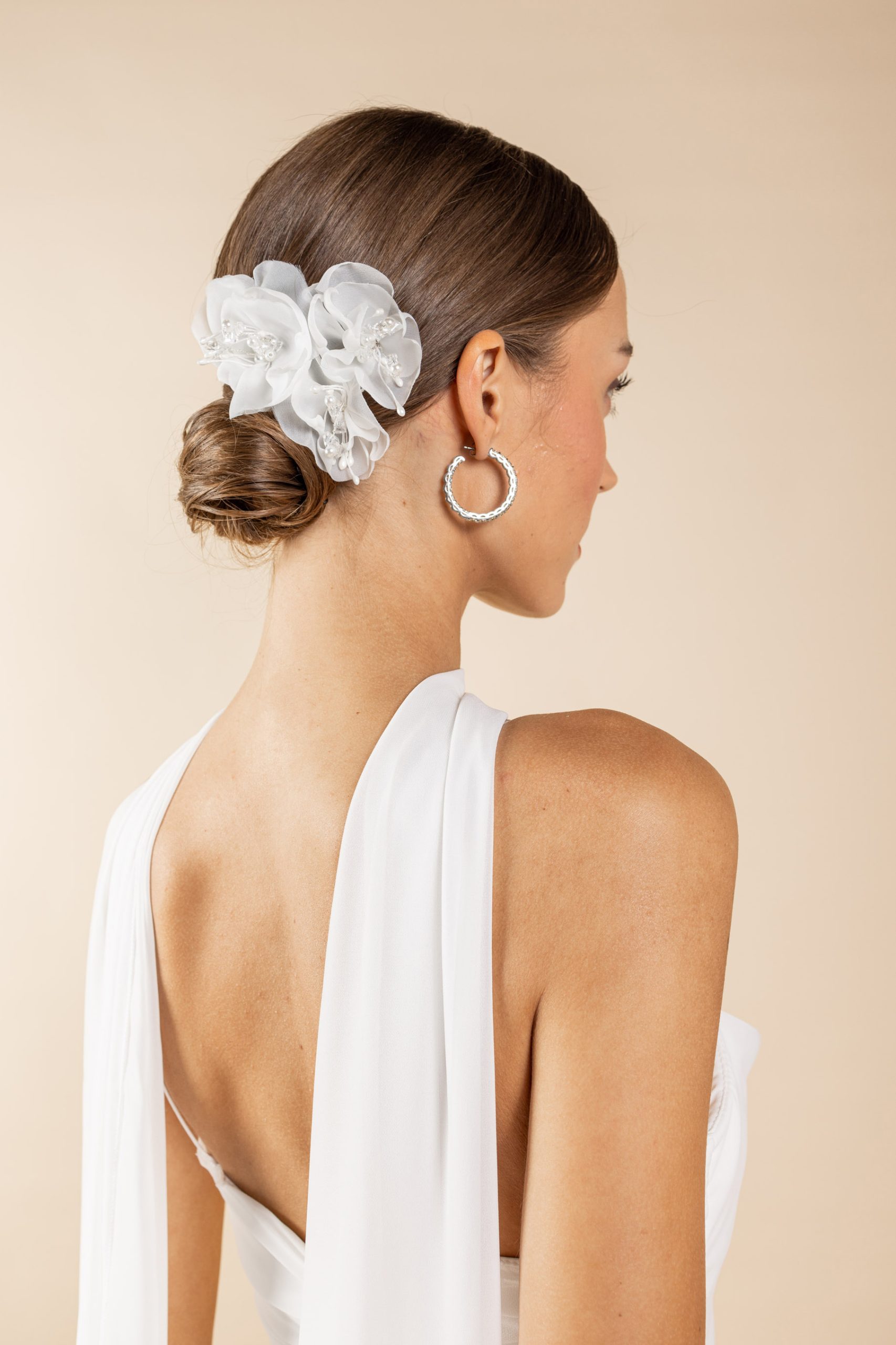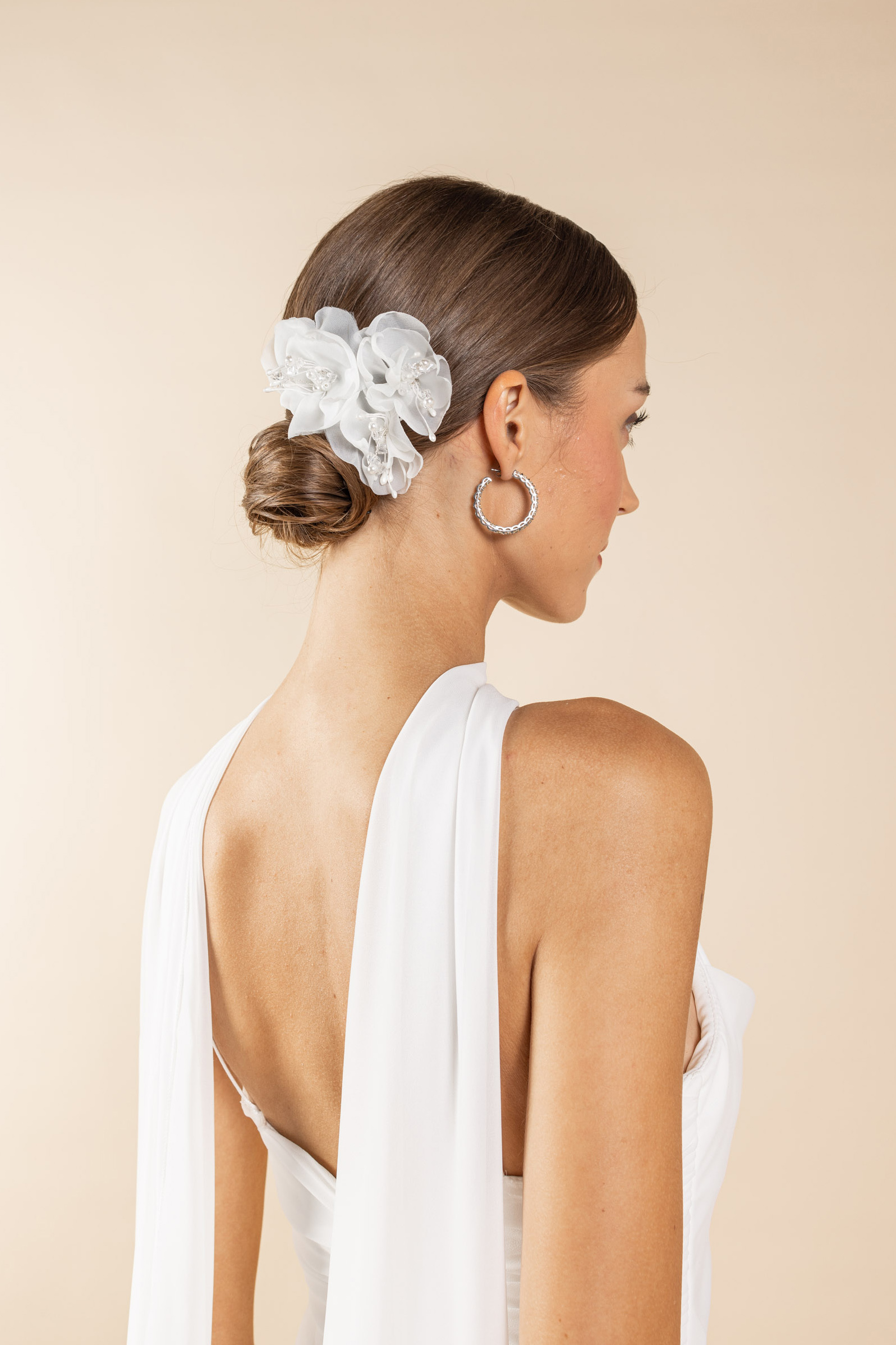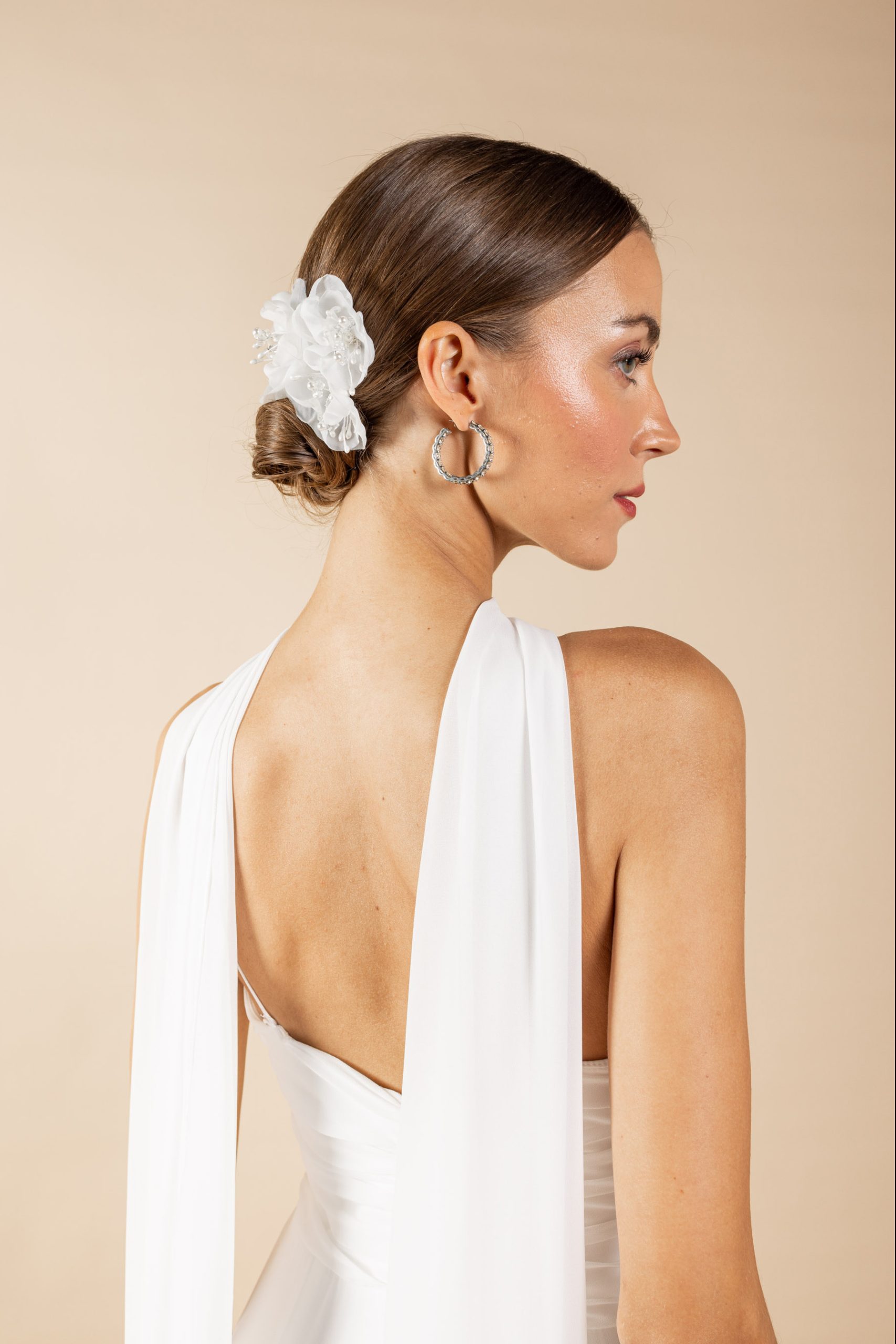 kristal işlemeli organze çiçek firkete, tüm beyaz elbiselerle kombinleyebileceğiniz çarpıcı bir aksesuardır. Büyükten küçüğe giden üç parça şeklinde tasarlanmıştır.