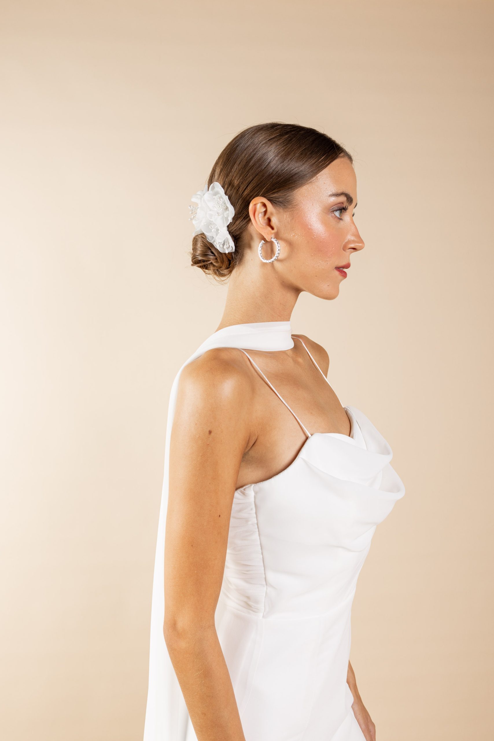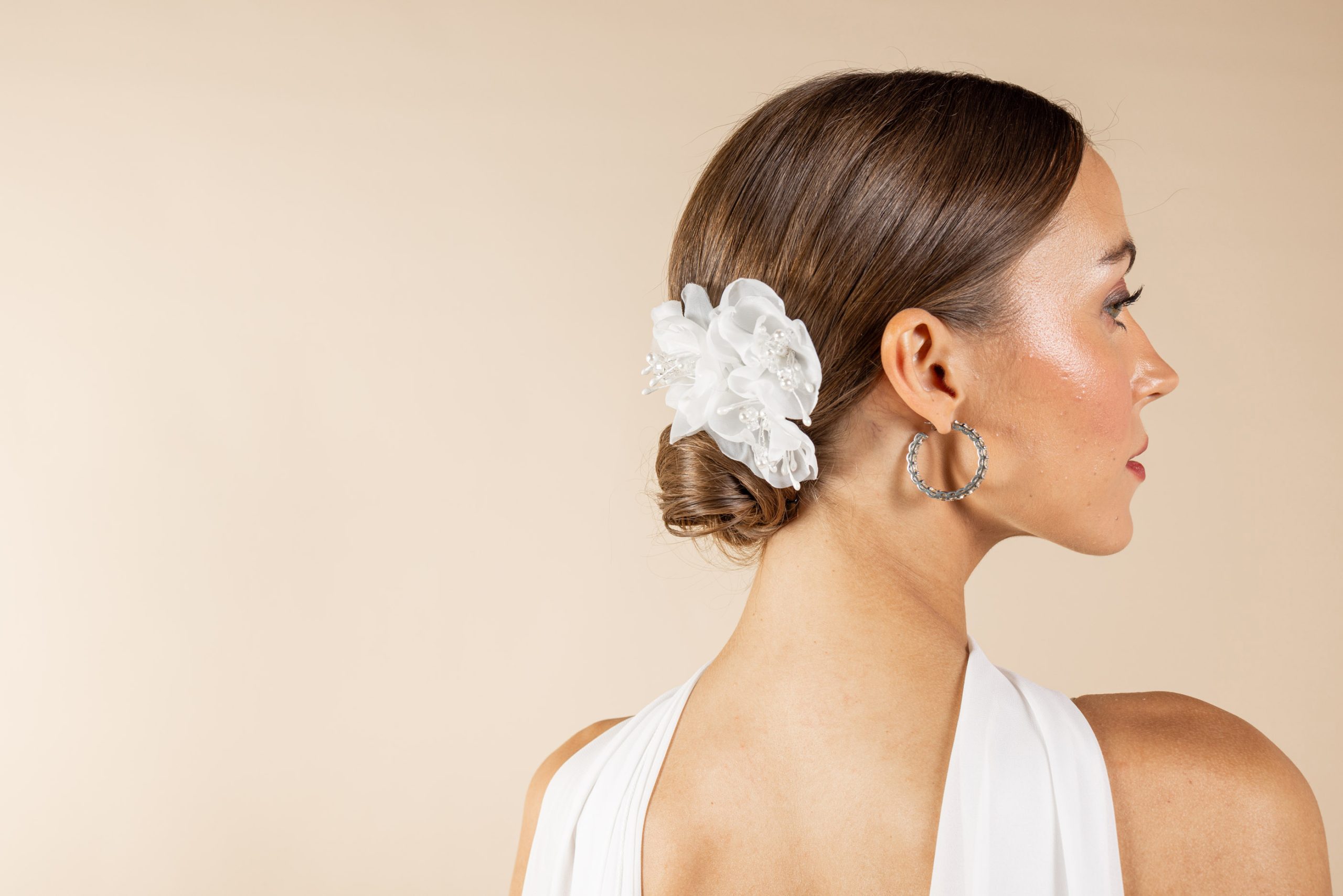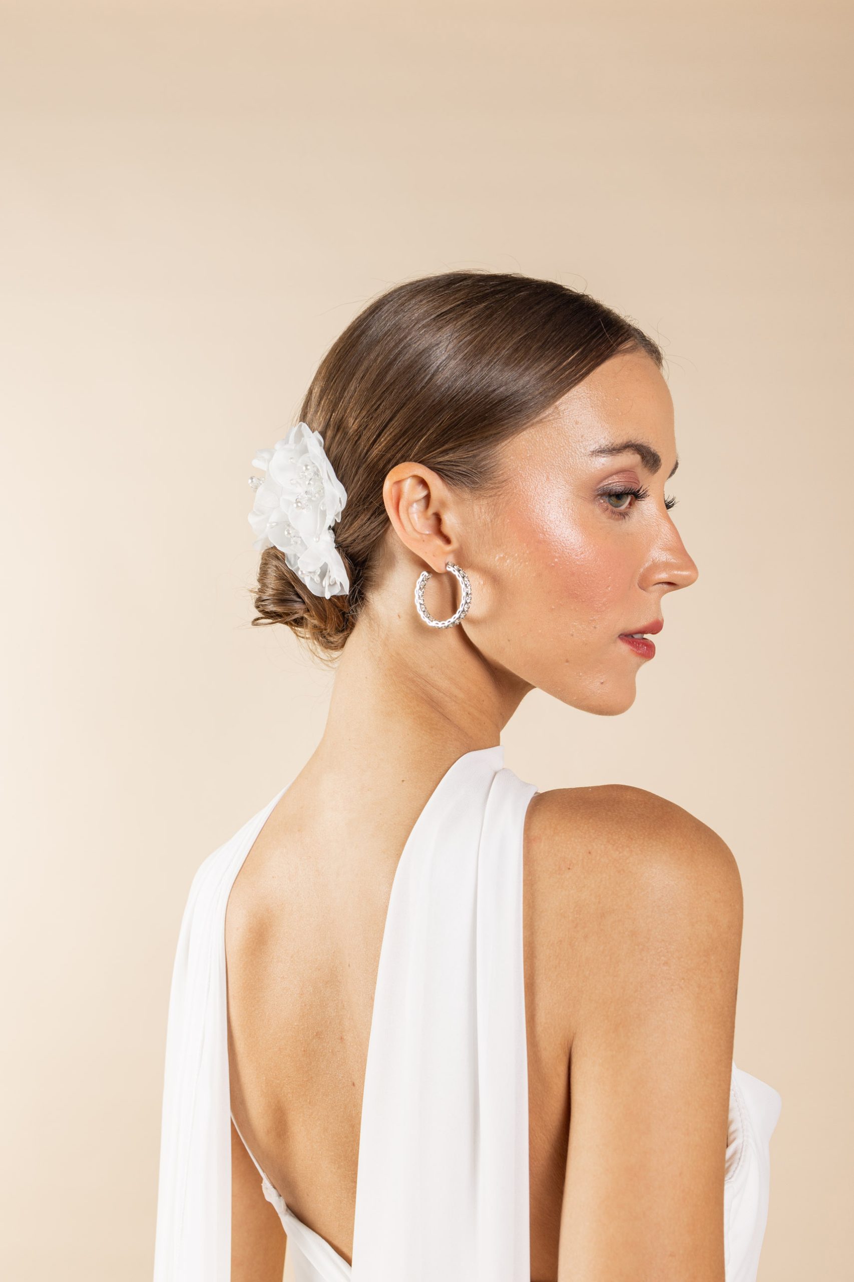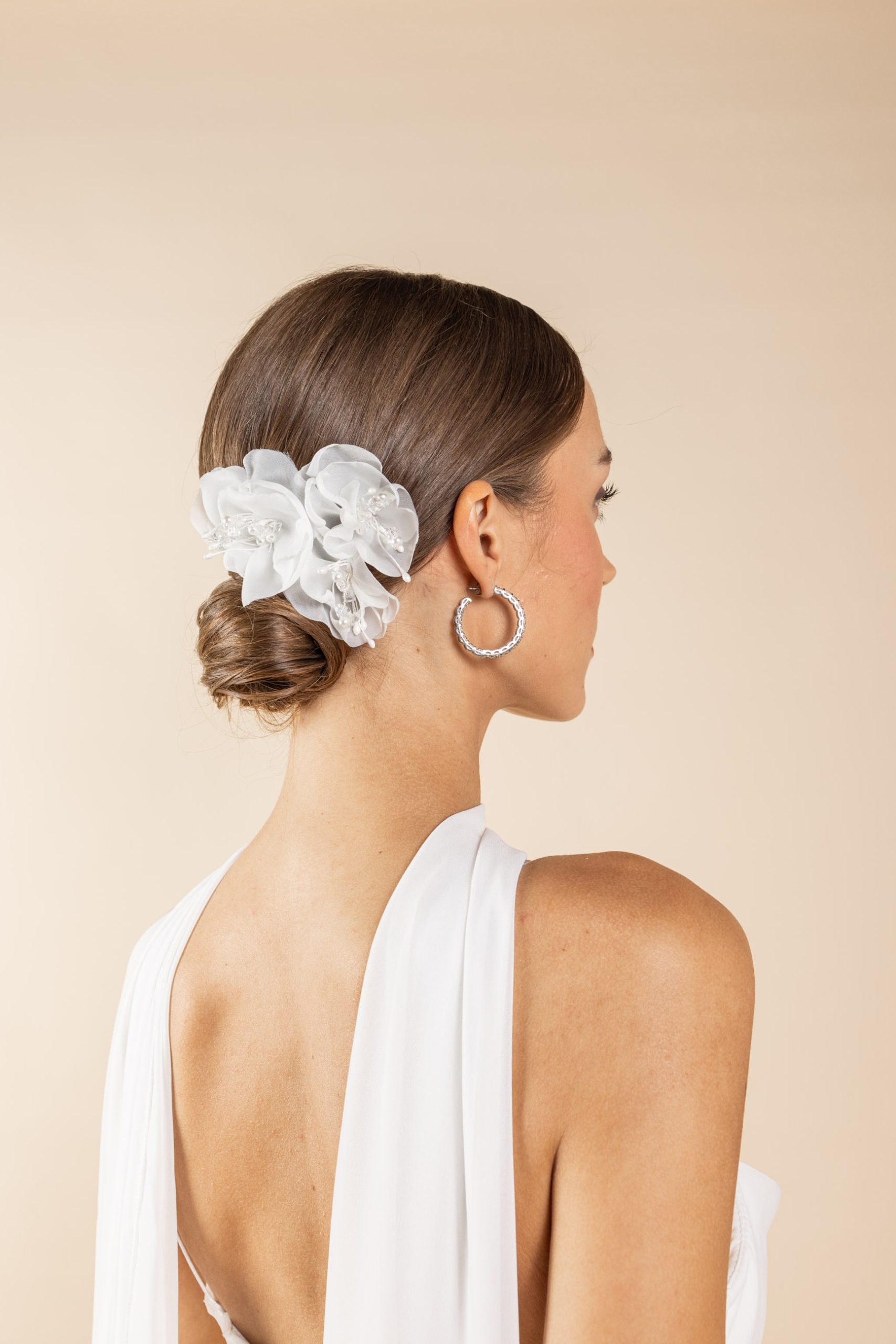 kristal işlemeli organze çiçek firkete, tüm beyaz elbiselerle kombinleyebileceğiniz çarpıcı bir aksesuardır. Büyükten küçüğe giden üç parça şeklinde tasarlanmıştır.