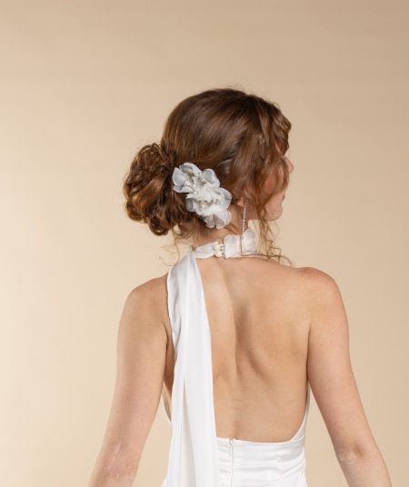 Üç boyutlu şifon çiçekli taç , tüm beyaz elbiselerle kombinleyebileceğiniz çarpıcı bir aksesuardır. Ayrıca elde hazırlanan kristal bir şerit üzerine monte edilmiştir.